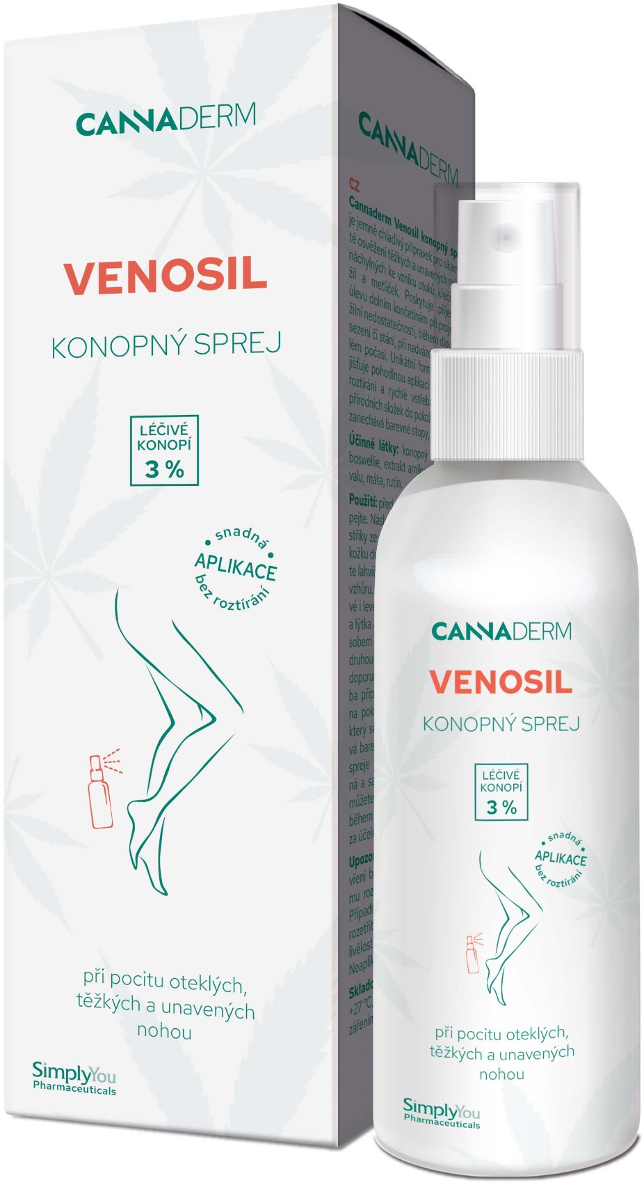 Sprej na nohy – vyhotovenie: dermo Venosil konopný sprej od CANNADERM je jemne chladivý prípravok na okamžité osvieženie ťažkých a unavených nôh náchylných na vznik opuchov, kŕčových žíl a metličiek. Poskytuje príjemnú úľavu dolným kon