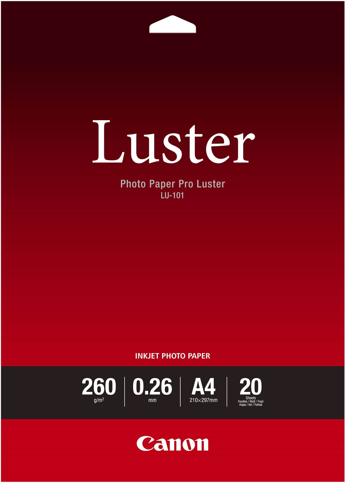 Fotopapier 20 listov, rozmer 21 × 29,7 cm (A4), určené pre atramentové tlačiarne, lesklý, gramáž 260 g/m² S fotografickým papierom Canon Photo Paper Pro Luster dosiahnete na vašich fotografiách živé farby a úžasne kontrastnú čiernobielu. Tento profesionálny fotografický papier má lesklú textúru, ktorá sa