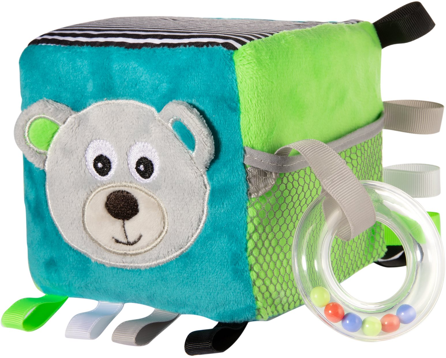 Motorická hračka – vhodná pre bábätká od vhodná pre deti od narodenia Plyšovú kocku so sivým medvedíkom si obľúbia všetci maličkí zvedavci. Okrem roztomilého ušatého chlpáča si hračka vašu ratolesť získa tiež zvonivým a šušťavým zvukom. Kocka je navyše vyrobená z rôznyc