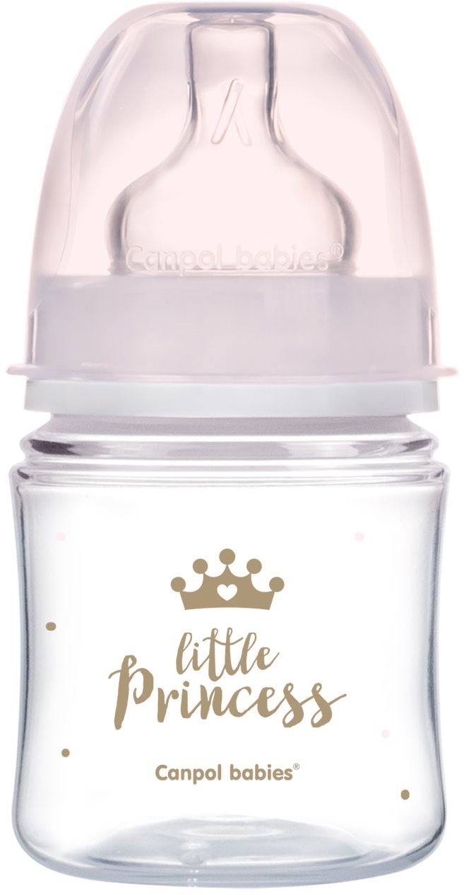 Dojčenská fľaša – vhodná pre dojčené deti od narodenia, objem 120 ml, antikoliková, materiál fľaše plast, silikónový cumeľ s 1 otvorom, pomalý prietok, vhodná do umývačky a mikrovlnnej rúry, cumlík a viečko súčasťou balenia, motív geometrické tvary, ružová farba Antikoliková fľaša Canpol babies ROYAL BABY bola vytvorená špeciálne pre najmenšie deti. Umožňuje kombinovať dojčenie s kŕmením z fľaše a stať sa tak podporou dojčiacej matky. Dojčenská fľaša má mäkký