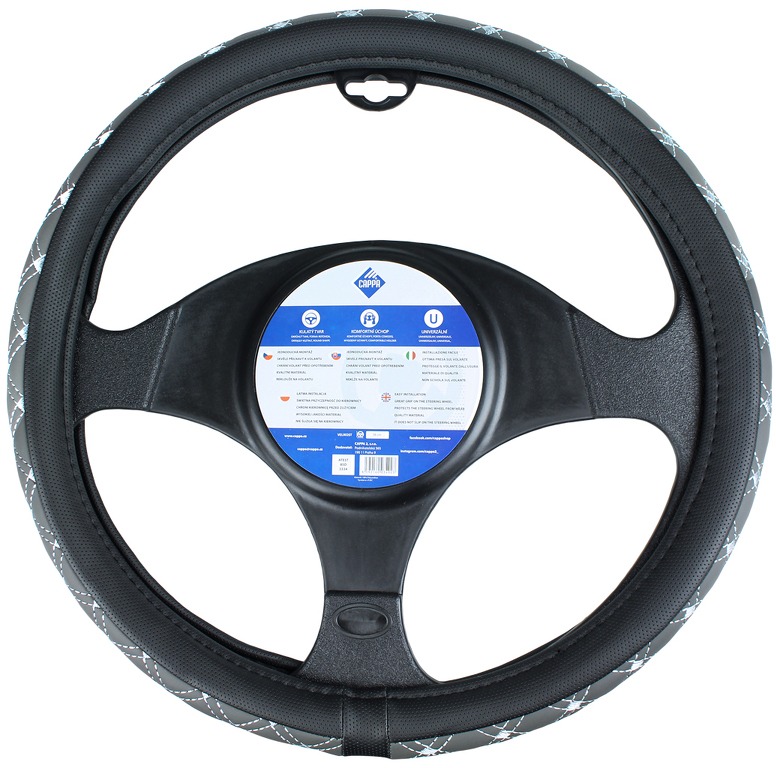 Poťah na volant – kožený, na volanty s priemerom 37 – 39 cm, bráni šmýkaniu rúk, chráni volant pred opotrebovaním, čierna a sivá farba Zaistite si pri jazde autom v zime pohodlie a zaobstarajte si nový odnímací poťah na volant Cappa. S týmto poťahom si iba nahrejete volant a na jazdu ho zložíte. Využijete ho na volanty s priemerom 37