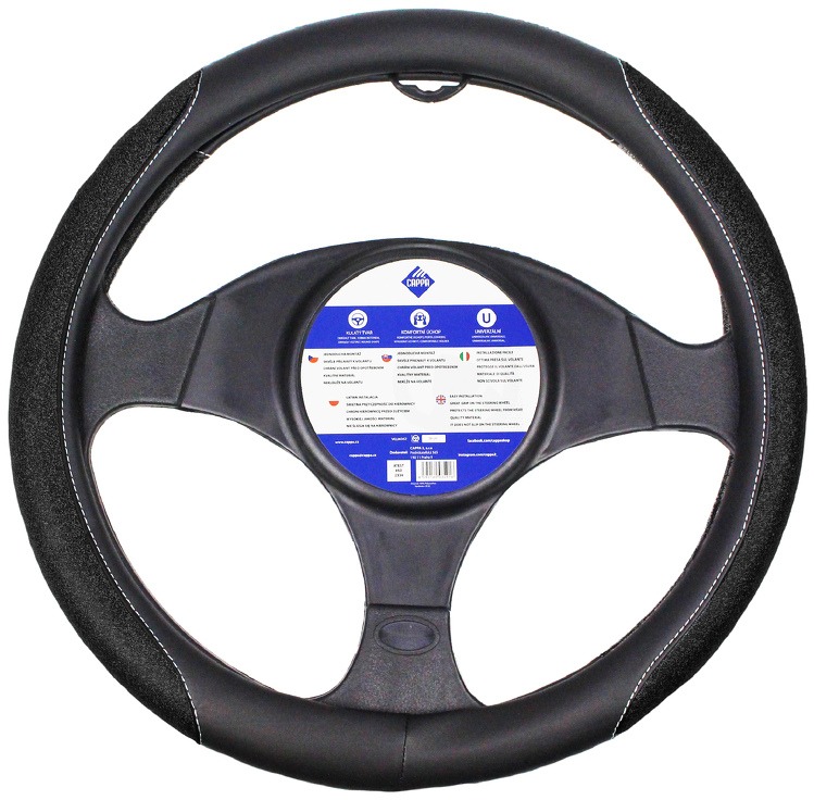 Poťah na volant – kožený, na volanty s priemerom 37 – 39 cm, bráni šmýkaniu rúk, chráni volant pred opotrebovaním, čierna farba Doprajte si vyšší komfort pri vedení vozidla v zime a zaobstarajte si praktický odnímací poťah na volant Cappa. Poťah sa v tomto prípade využíva na nahriatie volantu a na jazdu sa dáva dole. Hodí sa n