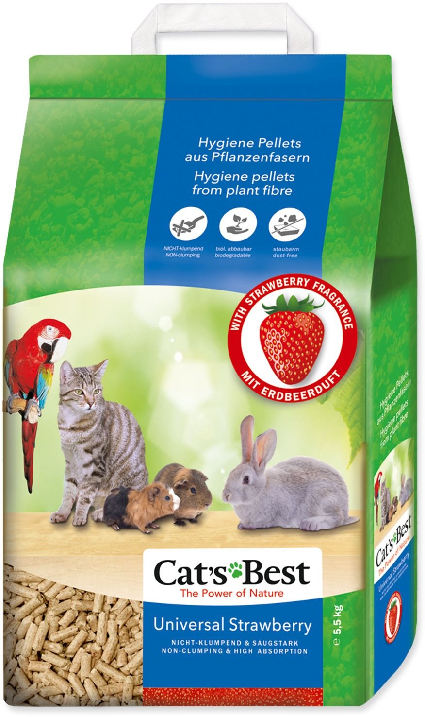 Podstielka pre mačky – peletková, s vôňou a pohlcujúca pachy, 5,5 kg/10 l Univerzálna podstielka pre mačky a drobné domáce zvieratá Cat’s Best Universal10 l/5,5 kg s vôňou jahôdNehrudkujúca podstielka Cat’s Best Universal je ekologicky a ekonomicky udržateľná, viacúčelová p