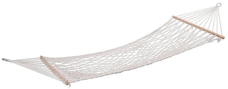 Hojdacia sieť – pre 1 osobu, nosnosť 115 kg, oká na zavesenie na háčik, dĺžka plochy na ležanie 200 cm, biela farba Outdoorová hojdacia sieť Cattara, upevniteľná pomocou dvoch závesných krúžkov, je na oboch koncoch osadená drevenými, rozpernými tyčami, ktoré zaisťujú vynikajúcu stabilitu a s ňou spojenú vysokú mier
