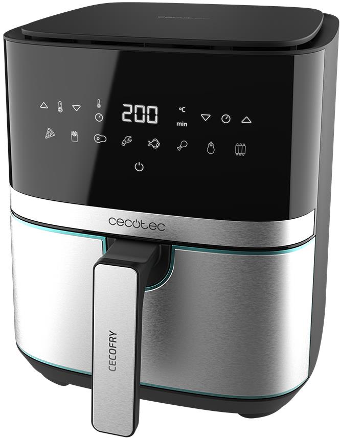 Teplovzdušná fritéza – digitálne ovládanie, nastaviteľná teplota od 80 do 200 °C, s nepriľnavým povrchom, s displejom, s ochranou proti prehriatiu, časovač, udržanie teploty, regulácia teploty a automatické programy, 8 programov, vyberateľná nádoba súčasťou, príkon 1700 W, objem nádoby 5,5 l, antikorová nádoba s nepriľnavým povrchom, 1 fritovací kôš, hmotnosť 2,5 kg, rozmery 31,6 × 26 × 30,5 cm (V׊×H), čierna a strieborná farba Teplovzdušná fritéza CECOTEC vám pripraví vaše obľúbené pokrmy s minimálnym množstvom tuku. Nádoba fritézy ponúkne nadštandardný objem 5,5 l. Nádoba je vyrobená z nehrdzavejúcej ocele, ktorá je záruko