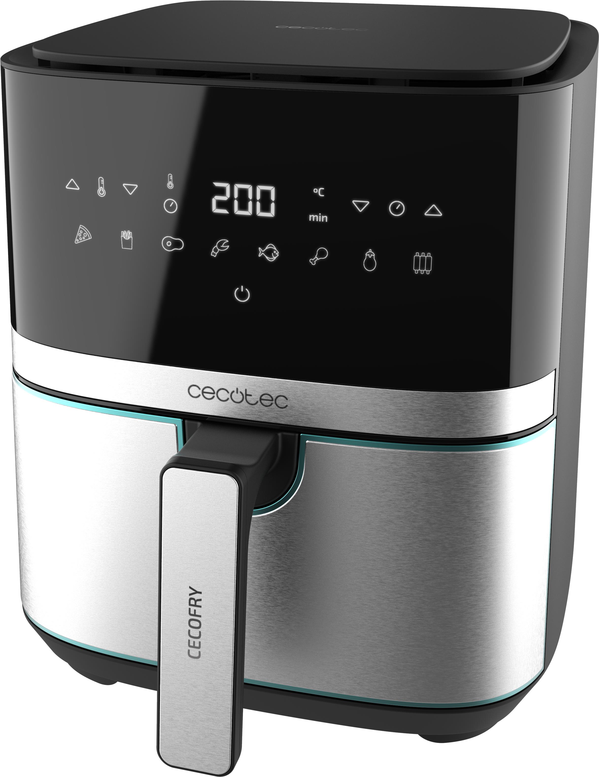 Teplovzdušná fritéza – digitálne ovládanie, nastaviteľná teplota od 80 do 200 °C, s nepriľnavým povrchom, s displejom, s ochranou proti prehriatiu, s termostatom, časovač, udržanie teploty, regulácia teploty a automatické programy, 8 programov, vyberateľná nádoba, plech a kliešte súčasťou, príkon 1700 W, objem nádoby 5,5 l, antikorová nádoba s nepriľnavým povrchom, 1 fritovací kôš, hmotnosť 2,8 kg, rozmery 31,6 × 26 × 30,5 cm (V׊×H), čierna a strieborná farba Teplovzdušná fritéza CECOTEC vám umožní pripraviť obľúbené pokrmy s minimálnym množstvom tuku. Nádoba fritézy disponuje nadštandardným objemom 5,5 l. Nádoba je vyrobená z nehrdzavejúcej ocele, ktorá z