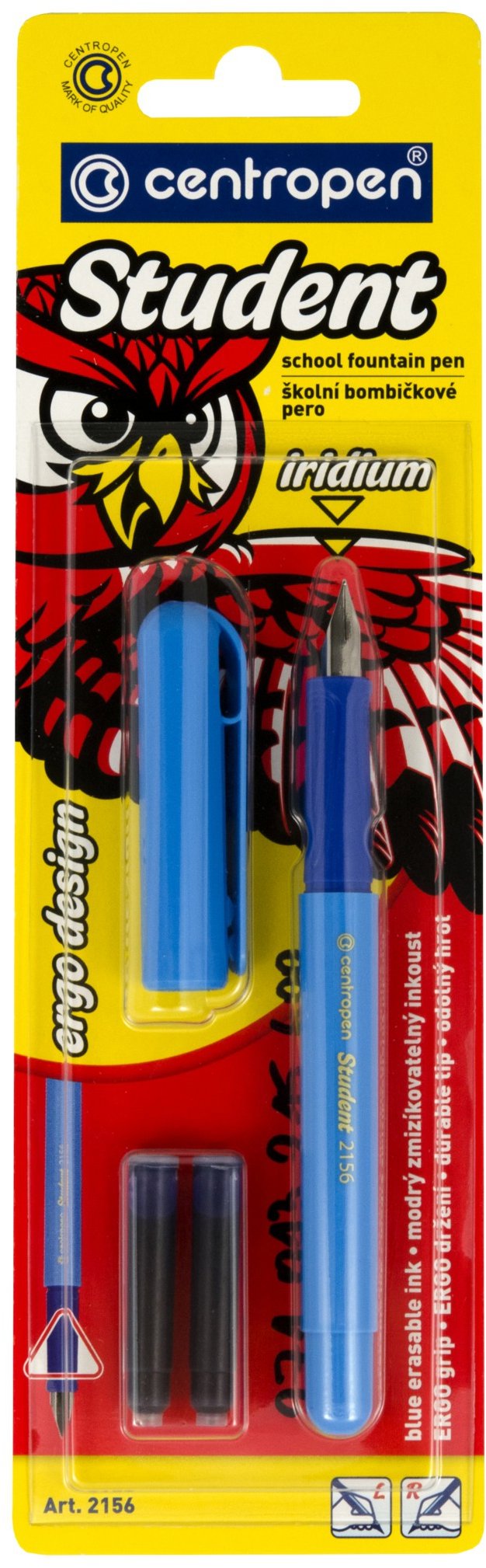 Plniace pero – zmizíkovateľný atrament, modrá farba, vymeniteľná náplň, dotykový hrot a ergonomický úchop, vhodné pre pravákov a pre ľavákov, 1 kus v balení, materiál plast, šírka stopy 0,3 mm, s nasadzovacím uzáverom Zásadné vlastnosti plniaceho pera CENTROPEN STUDENT 2156 + 2 bombičky (náhodná farba pera) Plniace pero Centropen rozvíja rukopis a vyjadruje osobný vzťah k písaniu Uzáver zabráni poškodeniu hrotu per