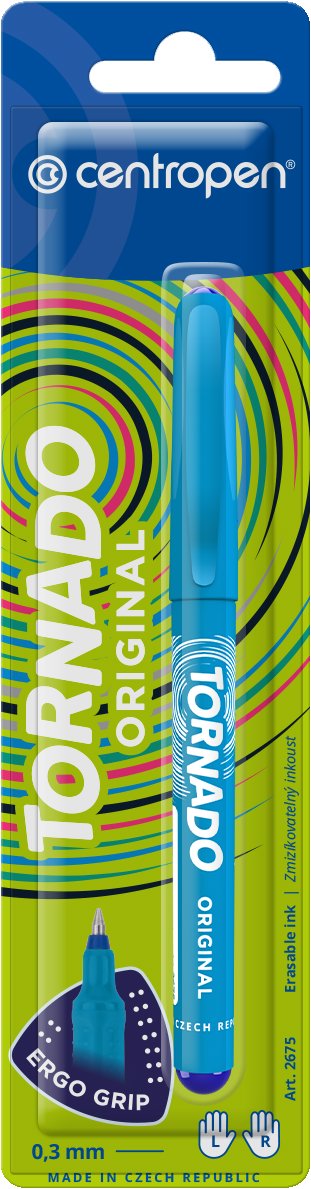Roller – zmizíkovateľný atrament, modrá farba náplne, dotykový hrot a ergonomický úchop, pre pravákov a pre ľavákov, materiál plast, šírka stopy 0,3 mm, šírka hrotu 0,5 mm, s nasadzovacím uzáverom Zásadné vlastnosti rollera CENTROPEN Tornado 2675 original (náhodná farba pera) Keramické pero alebo roller Centropen je obľúbenou písacou potrebou Predstavuje skvelé spojenie výhod guľôčkového a plni