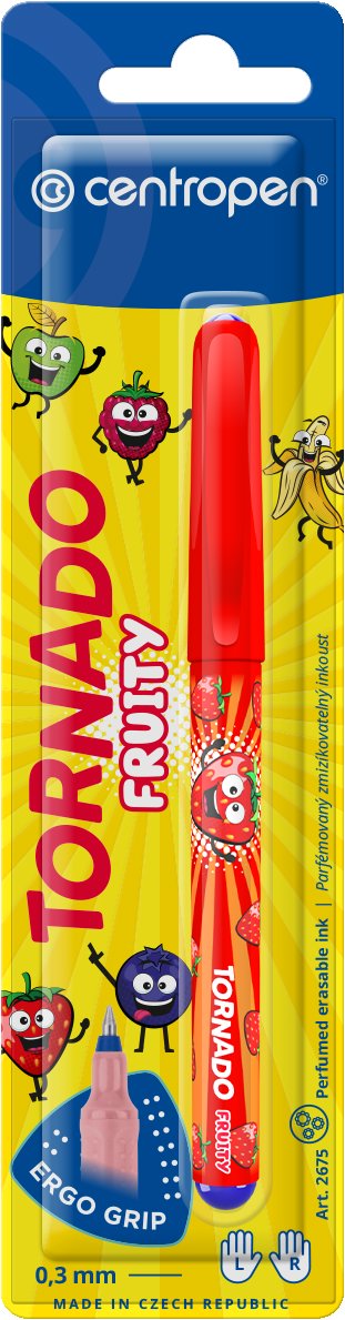 Roller – zmizíkovateľný atrament, modrá farba náplne, dotykový hrot a ergonomický úchop, pre pravákov a pre ľavákov, materiál plast, šírka stopy 0,3 mm, šírka hrotu 0,5 mm, s nasadzovacím uzáverom Kľúčové prednosti rollera CENTROPEN Tornado Fruity 2675 Keramické pero alebo roller Centropen oceníte pri každodennom písaní Spája kladné vlastnosti plniacich a guľôčkových pier Umožňuje bezproblémové