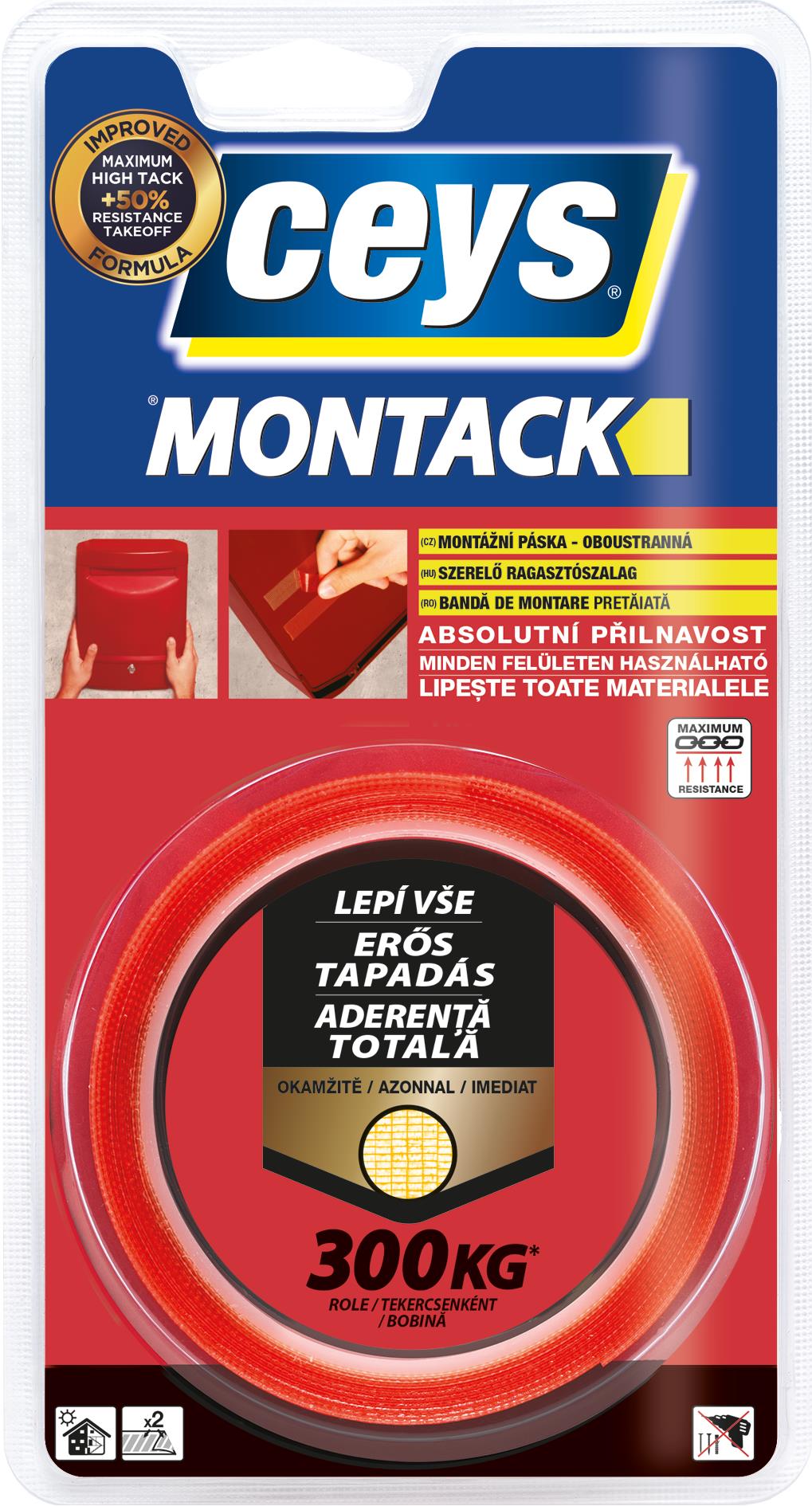 Lepiaca páska – obojstranná, návin 2,5 m, šírka 19 mm, vhodná na sklo, kov, keramiku, plast, drevo a kameň, odstrániteľná bez zvyškov, odolná proti vlhkosti, tepelná odolnosť maximálne do 75 °C, červená farba Kľúčové vlastnosti lepiacej pásky CEYS MONTACK 2,5 m × 19 mm Lepiaca páska CEYS zlepí sklo, kov, keramiku, plast, drevo a kameň Je odolná voči vlhkosti Na dĺžku má 2,5 m a jej šírka je 19 mm Farba pás