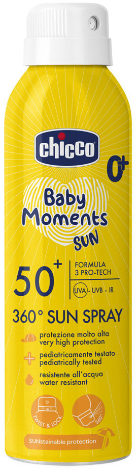 Sprej na opaľovanie – Pre deti, ochranný faktor 50, na tvár a na telo, vyhotovenie: bio, ekologické a prírodné, na normálnu pokožku, objem 150 ml Túžite po spoľahlivej ochrane pokožky pred slnečnými lúčmi? Spoľahnite sa na opaľovací krém Chicco. Pýši sa ochranným faktorom 50 SPF . Zásadné prednosti produktu CHICCO Detský sprej 360 ° SPF50 +, 15