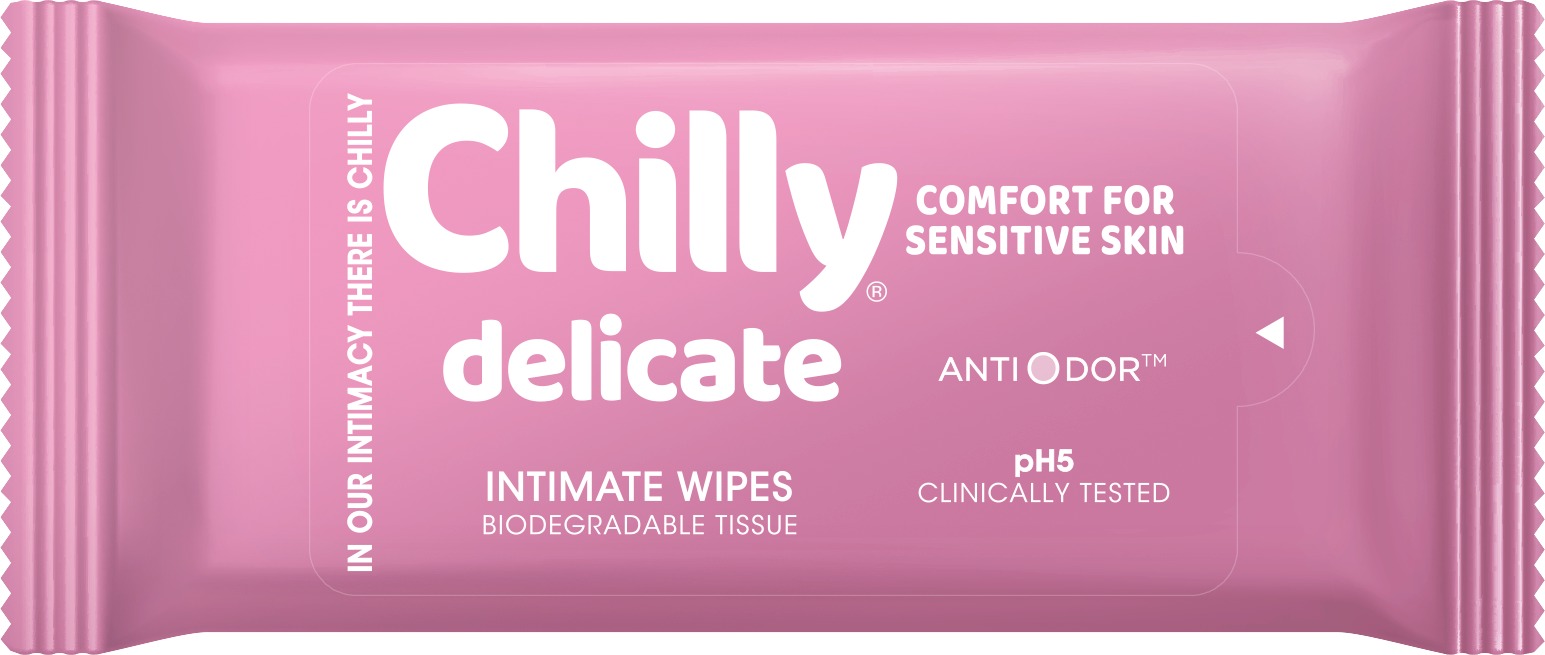 Vlhčené obrúsky – na intímnu hygienu, čistiaci, hydratačný, zjemňujúci a upokojujúci účinok, splachovateľná, obsahujú rastlinné výťažky a kyselinu mliečnu, s parfumovaním, vhodná je normálna a citlivú (sensitive) pleť, 12 ks v balení Intímne obrúsky Chilly sú skvelou voľbou pre ženy, ktoré sa chcú cítiť sviežo na cestách aj mimo domova. Vďaka šetrnému zloženiu, ktoré obsahuje aloe a hamamel, zjemňujú a upokojujú oblasť intímnych p