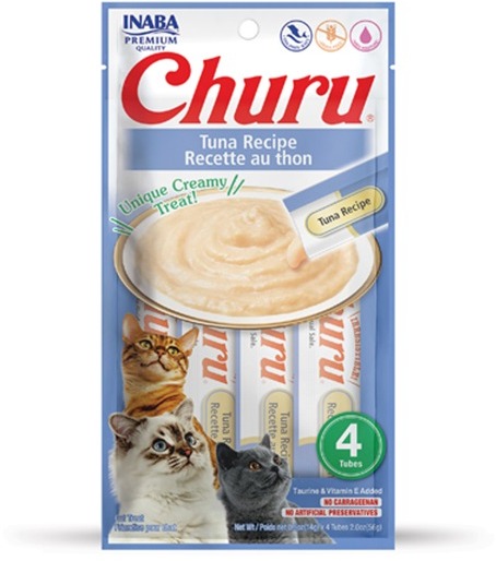 Maškrty pre mačky – odmena, pre všetky plemená s normálnou aktivitou, receptúra: tuniaková, hrubé bielkoviny 8,5 %, tuky 0,5 %, bez obilnín, bez konzervantov a diétne Tuniakové pyré Ciao Churu Cat sú šťavnaté, mäkké a extra lahodné mäsové mini kapsičky pre mačky s divokým morským tuniakom a pridaným vitamínom E. Pyré krémové konzistencie neobsahuje obilniny a je úp