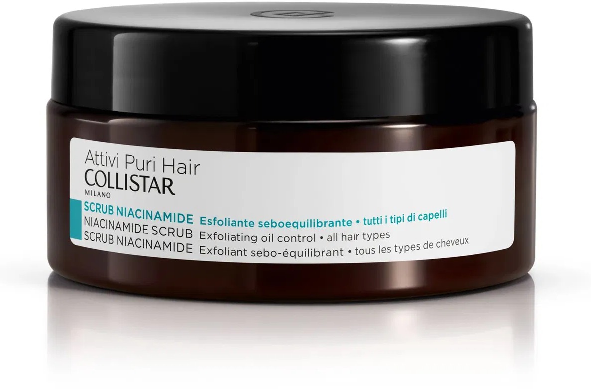Peeling na pokožku hlavy – exfoliačná detoxikačná kúra, vyrovnáva kožný maz, jemne odstraňuje prebytočný kožný maz a ďalšie nečistoty z pokožky hlavy, vhodné pre všetky typy pokožky hlavy COLLISTAR Niacinamide Scrub je starostlivosť vhodná predovšetkým pre rýchlo sa mastiacu pokožku hlavy s obsahom niacinamidu a exfoliačných zložiek. Napomáha odlučovať odumreté kožné bunky, nahromadený