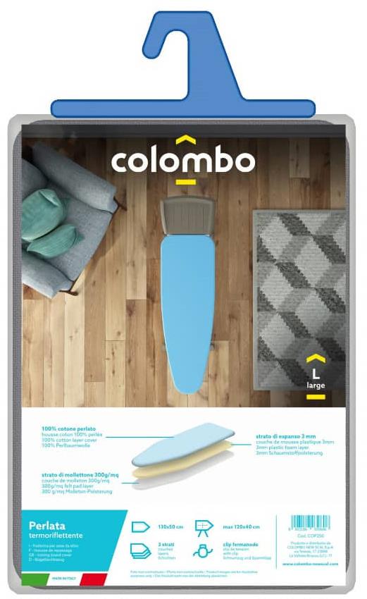 Poťah na žehliacu dosku – 3 vrstvy, 100% metalizovaná bavlna, 3mm penová vrstva, plstená podložka, stiahnutie na klip, rozmer 130 × 50 cm, použiteľné na žehliacu dosku max 120 × 40 cm Poťah na žehliacu dosku COLOMBO BA-PERLATE dokonale uľahčí žehlenie. Tvorený je 3 vrstvami, a to 100-percentnou metalizovanou bavlnou, 3 mm penovou vrstvou a plstenou podložkou s gramážou 300 g/m². Vh
