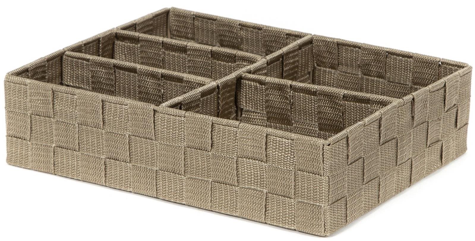 Organizér do zásuvky – zapletená textília, vnútorný kovový rám, na prehľadné usporiadanie drobných vecí alebo bielizne, do zásuviek, poličiek, šatníkových skríň, 5 priehradiek, 32×25×8cm