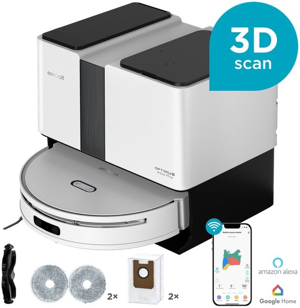 Robotický vysávač s mopom – pre alergikov a na zvieracie chlpy, na všetky druhy podláh, na suché čistenie, HEPA, automatické dobíjanie, senzor proti nárazu, pokračovanie upratovania po samostatnom dobití, automatické vysypanie a senzor proti pádu zo schodov, ovládanie mobilnou aplikáciou zberná nádoba, 2 bočné kefy, prekoná prekážky do výšky 2 cm, laserová navigácia, doba prevádzky 270 min, doba nabíjania 6 h, hlučnosť 75 dB, rozmery 8,6 × 37,6 × 32 cm (V׊×H), akumulátor a nabíjacia stanica súčasťou balenia OPTIMUS Agua Pro Laser 3D Concept VR4050Robotický vysávač s mopom 2 v 1Robotický vysávač Concept VR4050 2 v 1 OPTIMUS Aqua Pro Laser 3D prináša dokonalé a bezstarostné upratovanie domácnosti. Kombinuj