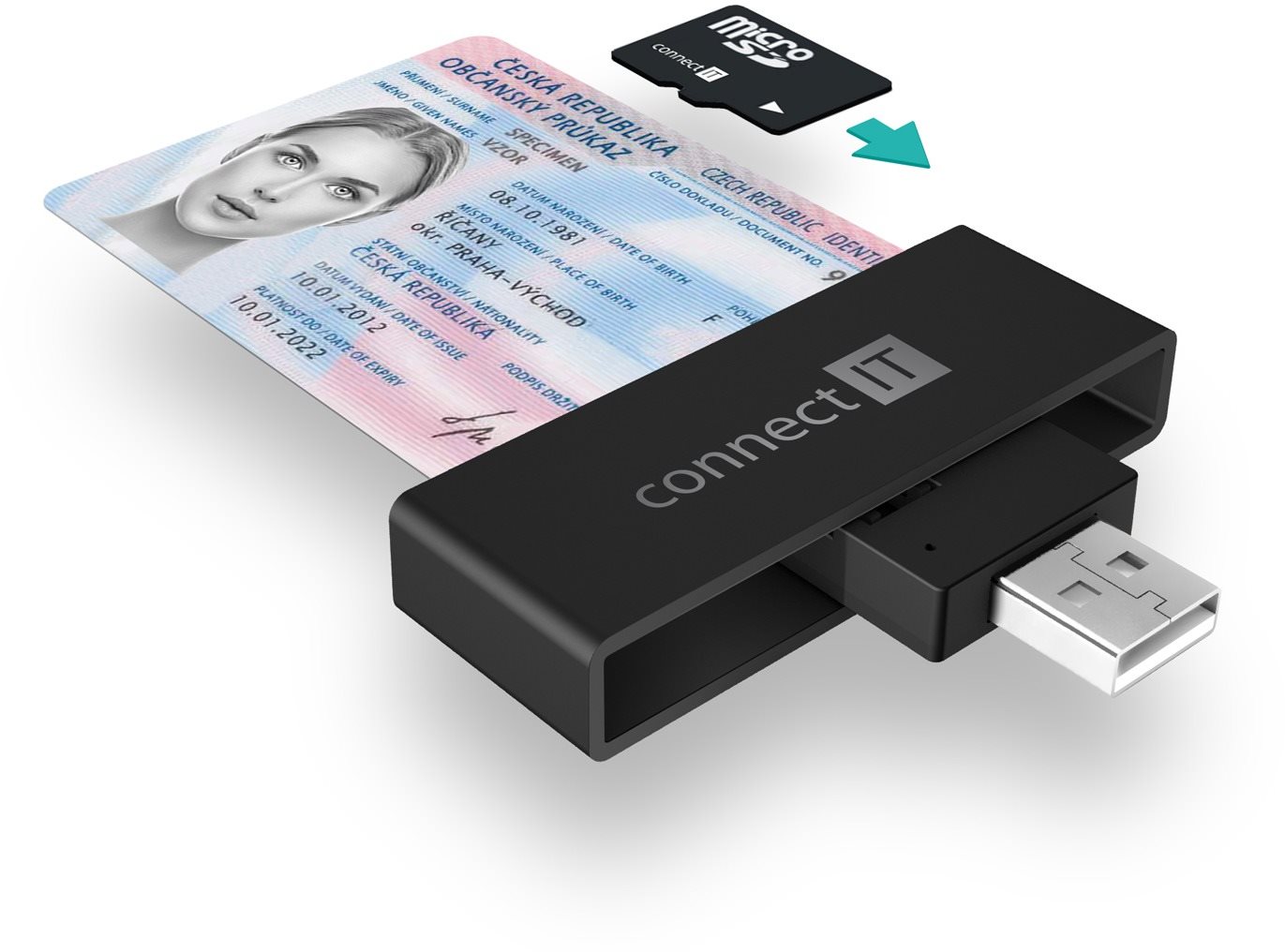 Čítačka občianskych preukazov – USB, slot na Smart Card s podporou občianskych preukazov,bankových kariet s čipom a Smart, slot na pamäťové karty micro SD/SDHC/SDXC, Trans Flash, ISO 7816, triedy A, B a C (5V. 3V a 1.8V), podpora protokolov T0, T1, I2C, SLE 4432/42 (S=10), SLE 4418/28 (S=9), podpora I2C kariet SLE4418, SLE4428, SLE4432, SLE4442, SLE4436, SLE5536, SLE6636, AT88SC1608, AT45D041 Čítačka CONNECT IT umožňuje načítať dáta z eObčianky, či čipovej karty. Vyniká svojimi kompaktnými rozmermi, vďaka čomu sa veľmi jednoducho prenáša a môžete ju tak využiť odkiaľkoľvek. O ľahké prepoje