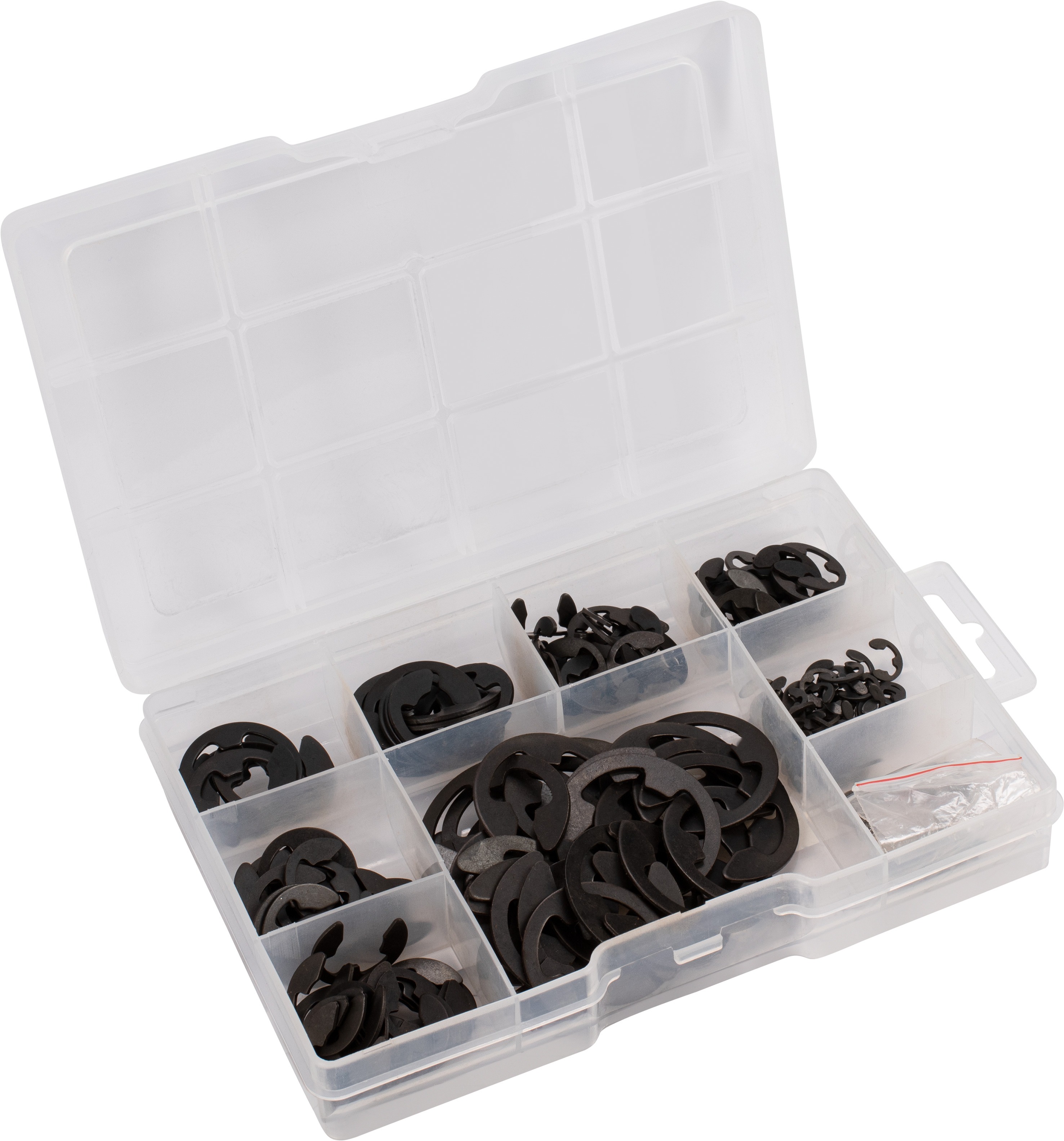 Poistné krúžky – súprava obsahuje Oceľové poistné strmeňové krúžky, E-clip 30 kusov 1,5 mm/30 kusov 3,0 mm/40 kusov 5,0 mm/50 kusov 6,0 mm/50 kusov 10 mm/40 kusov 12 mm/20 kusov 15 mm/20 kusov 19 mm/20 kusov 22 mm Súprava poistných krúžkov CONNEX je ideálna do každej dielne. Obsahuje 300 poistných strmeňových krúžkov typu E s priemerom 1,5, 3, 5, 6, 10, 12, 15, 19 a 22 mm. Uložená je v praktickej krabičke, ktor