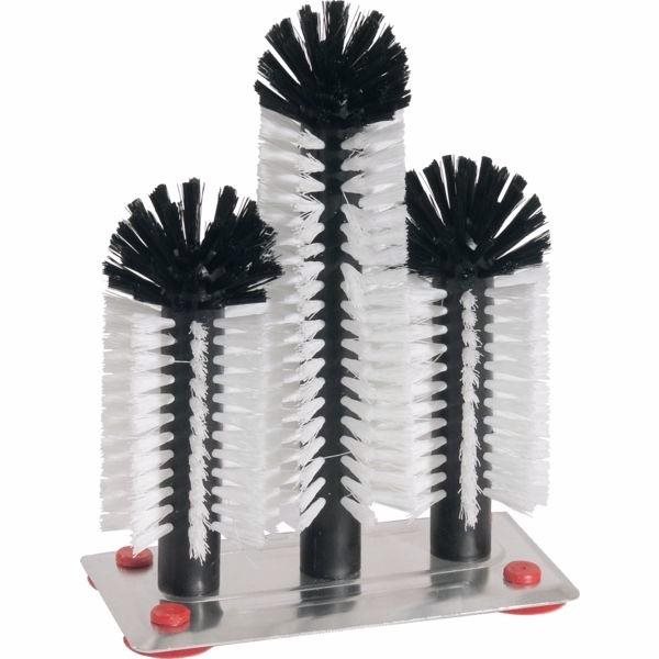 Držiak – kefa na poháre contacto, 3 kefy, čierne a biele štetiny z polypropylénu na hliníkovej doske so štyrmi prísavkami v spodnej časti