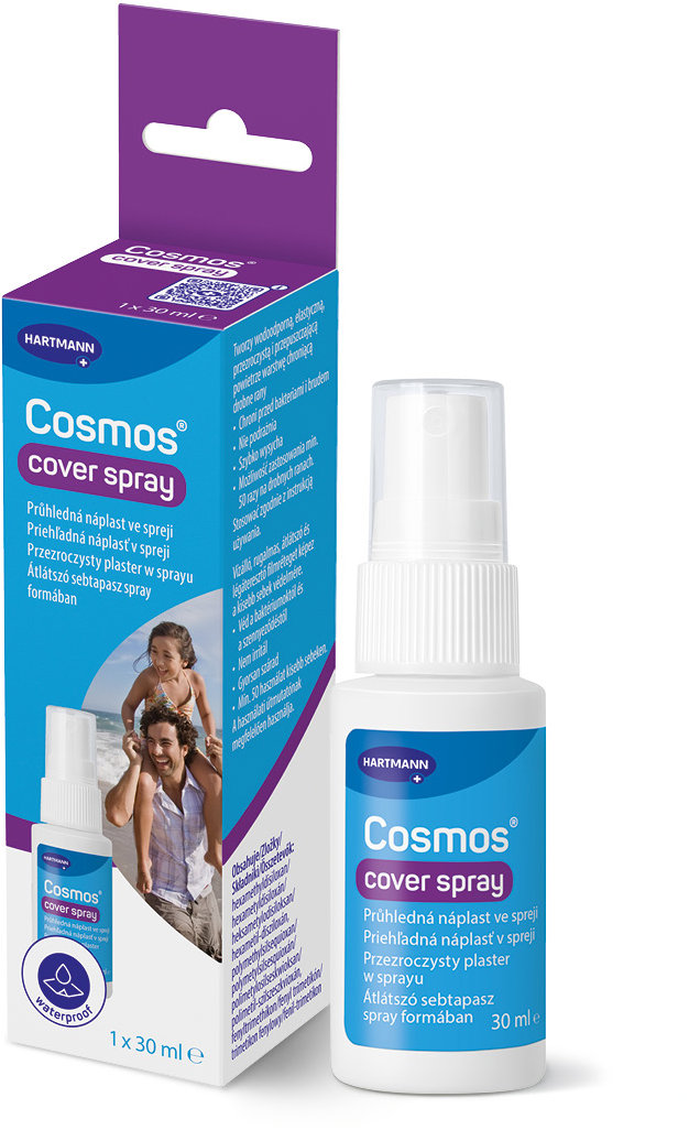 Leukoplast v spreji, Cosmos Cover Spray transparentná náplasť v spreji30 mlCover Spray je univerzálny tekutý sprej na ochranu pokožky bez obsahu alkoholu. Na koži vytvára vodoodolný, pružný, priehľadný a priedušný film, k