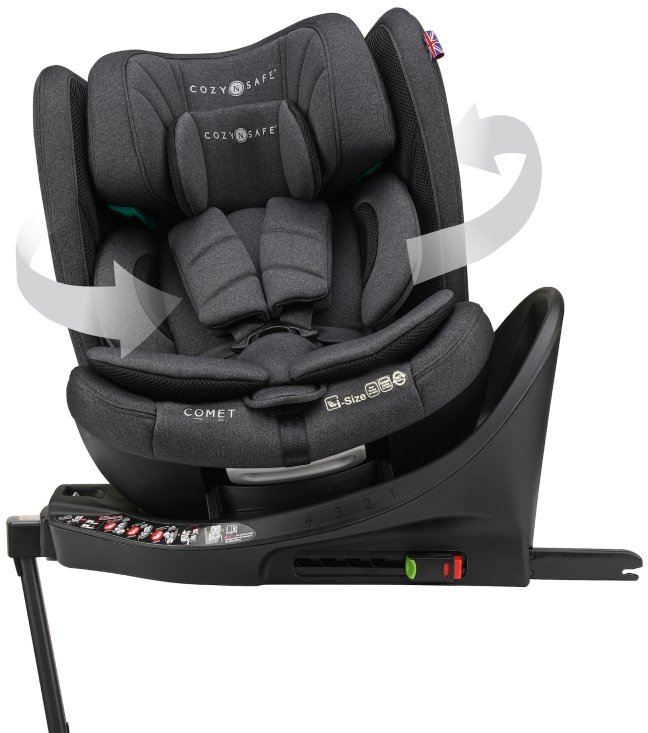 Autosedačka – pre deti s výškou od 40 do 150 cm, upevnenie pomocou ISOFIX a bezpečnostného pása, s možnosťou nastavenia sklonu operadla, bezpečnostného pása a opierky hlavy, certifikácia i-Size (R129), BESIP Skupina 0 a 0+, Skupina I, Skupina II a Skupina III (podľa európskych noriem ECE), zabezpečenie dieťaťa zaisťuje 5-bodový pás, otočná o 360°, možnosť sedenia v smere aj proti smeru jazdy, ochrana proti bočnému nárazu, snímateľný poťah a novorodenecká vložka, rozmery 68 × 46 × 72 cm (V׊×H), hmotnosť 14,5 kg, čierna a titán farba Autosedačka Cozy N Safe Comet i-Size 360° Graphite predstavuje univerzálne a bezpečné riešenie pre deti od narodenia až do približne 12 rokov. Vďaka svojej konštrukcii pokrýva všetky hlavné vekové sku
