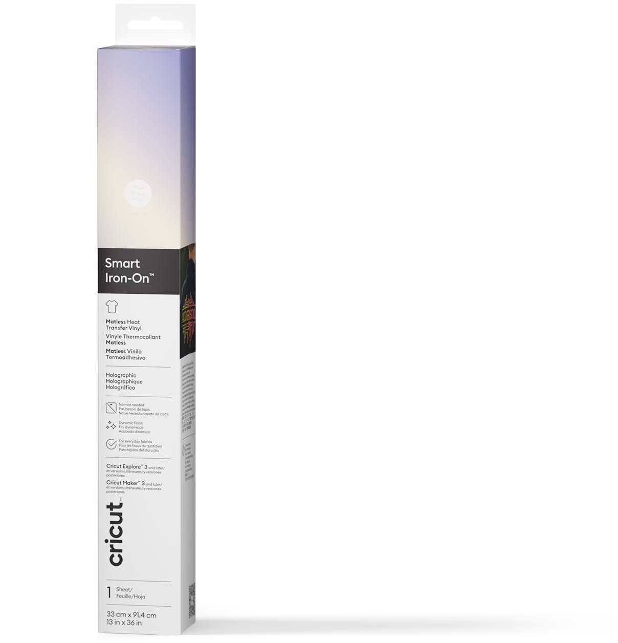 Nažehľovacia fólia – holografický efekt, Smart materiál bez podložky (matless), rolka 33 cm × 0,9 m (13″ × 3 ft), súvislé rezy až 3,6 m (12 ft), prenos motívu teplom, vydrží 30+ praní, ľahké rezanie a odburiňovanie, vhodné pre bavlnu, polyester, funkčné a pružné látky, pre Cricut Explore 3 a novšie Maker 3 a novšie a Cricut Venture, kompatibilná s Cricut termolismi, CPSIA compliant, bez olova a ftalátov Nažehľovacia fólia Cricut Smart Iron-On33 × 91 cm Holographic TransblueNažehľovacia fólia Cricut Smart Iron-On ™ Holographic (Transblue) je určená pre rýchle textilné projekty bez použitia rezacej pod