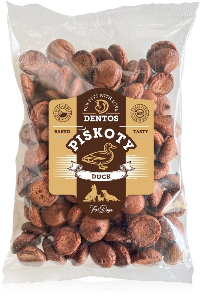 Piškóty pre psa vhodné pre plemená všetkých veľkostí, hmotnosť balenia: 0,3 kg Kľúčové vlastnosti psích piškót s kačacím mäsom Dafiko Dentos, 300 gDoplnkové krmivo pre psov s kačacím mäsomBohaté na dôležité živiny ako sú bielkoviny Podporujú zdravý svalový rast a správnu funkciu