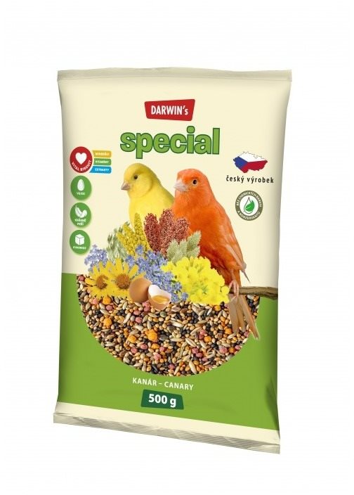 Krmivo pre vtáky – kŕmna zmes pre kanáriky, na zvýraznenie farby, obsahuje vajcia, hmotnosť 0,5 kg, obohatené o vitamín A, vitamín D3 a vitamín E Kompletné krmivo pre vtáky Darwin´s Special je určené pre kanáriky a obsahuje zvýšené množstvo vitamínov E, A a D3, ktoré podporujú ich zdravie. Zmes je navrhnutá tak, aby bola chutná, dobre stráviteľ