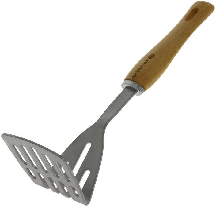 Pučidlo na zemiaky – s okom na zavesenie, kovové telo a drevená rukoväť, šírka 7,5 cm, dĺžka 29 cm, hnedá farba Rad riadu a kuchynských pomocníkov B Bois kvalitnej francúzskej značky de Buyer je vyrobený v kombinácii nehrdzavejúcej ocele a bukového dreva. Ani elegantné pučidlo na zemiaky nie je výnimkou. Jeho e
