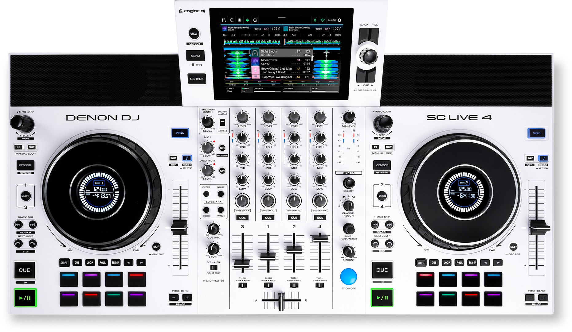 DJ konzola – All-in-One systém, doplnkové funkcie ovládanie osvetlenia, kompatibilný s Windows a macOS, dotykový displej a vstavané reproduktory, mikrofónny/AUX vstup Jack 6,3 mm a XLR, hlavný výstup (Master out) RCA a XLR, booth výstup (odposluchový) Jack 6,3 mm, slúchadlový výstup Jack 3,5 mm a Jack 6,3 mm, vo vybavení MIDI USB, bezdrôtové pripojenie cez WiFi, napájanie zo siete, licencia k softvéru súčasťou balenia, rozmery 718 × 99 × 403 mm (Š×V×H), hmotnosť 5800 g Denon DJ SC LIVE 4 je flexibilný standalone DJ kontrolér v bielej farbe so štyrmi deckmi. Ponúka priamu kompatibilitu so streamovacou službou Amazon Music Unlimited, ktorá poskytuje prístup