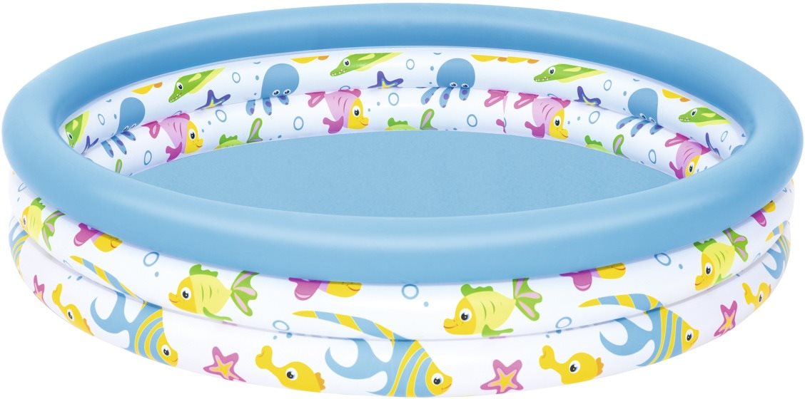 Detský bazén – vhodný od 3 rokov, s objemom 140 l, okrúhly tvar, nafukovací, opravná sada súčasťou, modrá, biela a žltá farba, motív more, materiál PVC, rozmery 25 × 122 × 122 cm (V × Š × D) rozmery 25 × 122 cm (výška × priemer) Detský nafukovací bazén Bestway s objemom 140 l umožňuje rýchle uvedenie do prevádzky a ľahké premiestnenie. Jeho steny sú vysoké iba 25 cm, preto bude bezpečný a vhodný aj pre tých najmenších. Bol vy