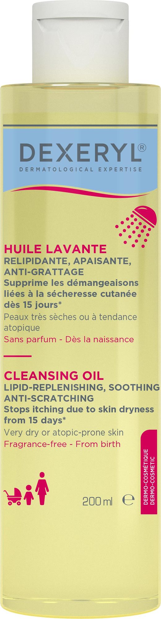 Sprchový olej – čistiaci a upokojujúci, na suchú pokožku, vyhotovenie dermo, objem 200 ml DEXERYL umývací olej je určený na problematickú, atopickú pokožku. Pri umývaní upokojuje suchú kožu a zamedzuje svrbeniu, ktoré súvisí so suchosťou pokožky. Je vhodný na veľmi suchú kožu so sklonom k