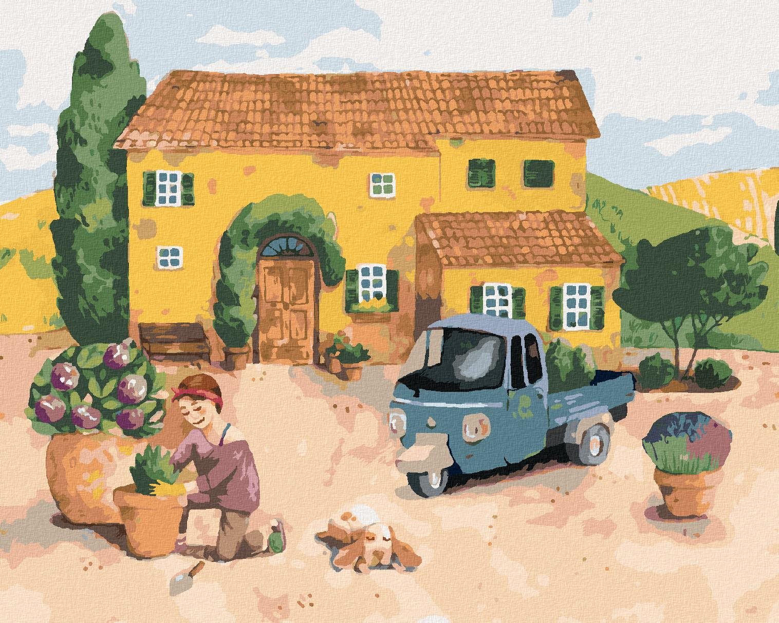 Diamantové maľovanie – motív krajiny a prírody, s rámom a s napnutím plátna, orientácia na šírku, okrúhle diamanty, 36 farieb, aplikačné pero, diamanty, ochranná fólia, pinzeta a vrecká v balení, vhodné od 4 rokov Kľúčové vlastnosti diamantového maľovania Diamondi – ŽENA SADIACA KVETY PRI DOME V PROVANCE, 40 × 50 cm, napnuté plátno na rám Diamantové maľovanie je vhodné pre všetkých tvorivých ľudí Námet: krajiny