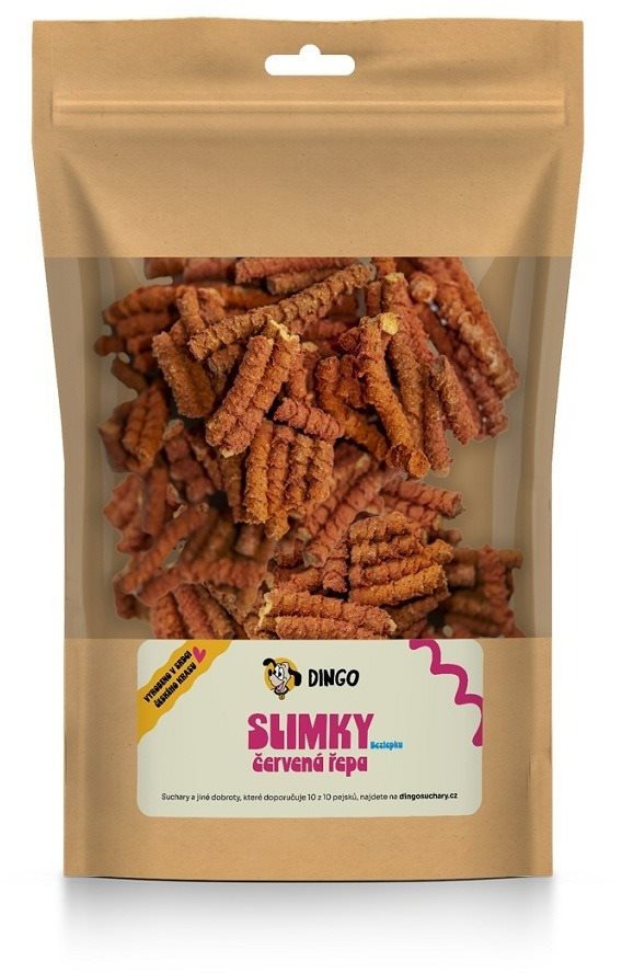Maškrty pre psov – bez obmedzenia veku s nízkou a normálnou aktivitou, vhodné pre kastrované zvieratá, zeleninová príchuť, hmotnosť balenia 0,25 kg, suché, hrubé bielkoviny 19,5 %, tuky 6,18 %, špecifiká zloženia bez GMO, diétne a bez soli Kľúčové vlastnosti maškrty pre psov Dingo Slimky červená repa, 250 gPomaly pečené repové podlhovasté maškrtyZachovávajú si výbornú chuť a chrumkavú štruktúru vďaka svojmu jedinečnému tvaruPrirodzeným