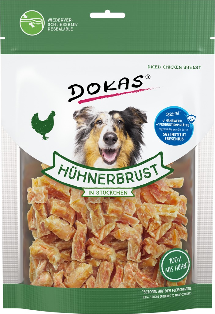 Maškrty pre psov – bez obmedzenia veku s normálnou aktivitou, kuracia príchuť, hmotnosť balenia 0,2 kg, suché, hrubé bielkoviny 57 %, tuky 3,4 %, bez obilnín, špecifiká zloženia bez konzervantov a bez GMO Kvalitné maškrty z kuracieho mäsa Dokas sú chutnou odmenou pre psov a sú ideálne pri výcviku alebo na zdravé maškrtenie. Vysoká kvalita použitých surovín zaručuje výraznú chuť a vôňu. Sú veľmi obľúben