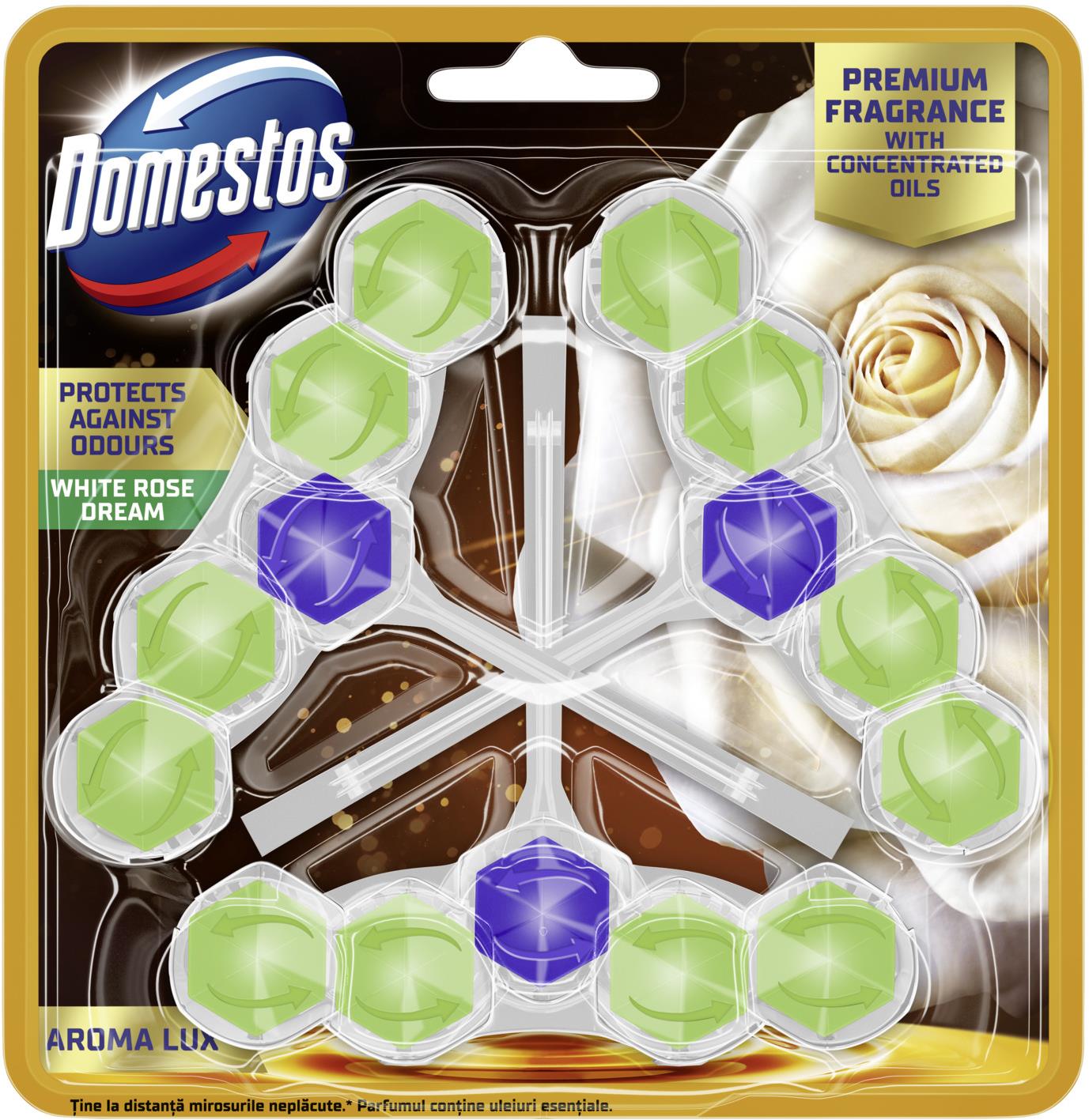 WC blok – pre hygienickú čistotu a sviežosť vašej toalety, dezinfekčný, bez chlóru, kvetinová vôňa, hmotnosť 150 g Domestos Aroma Lux White Rose 3× 50 g sú tuhé WC bloky s vôňou bielej ruže. Prinášajú revolučné riešenie na udržanie hygieny a sviežosti vašej toalety. Tieto bloky Domestos Aroma Lux White Rose obsahu