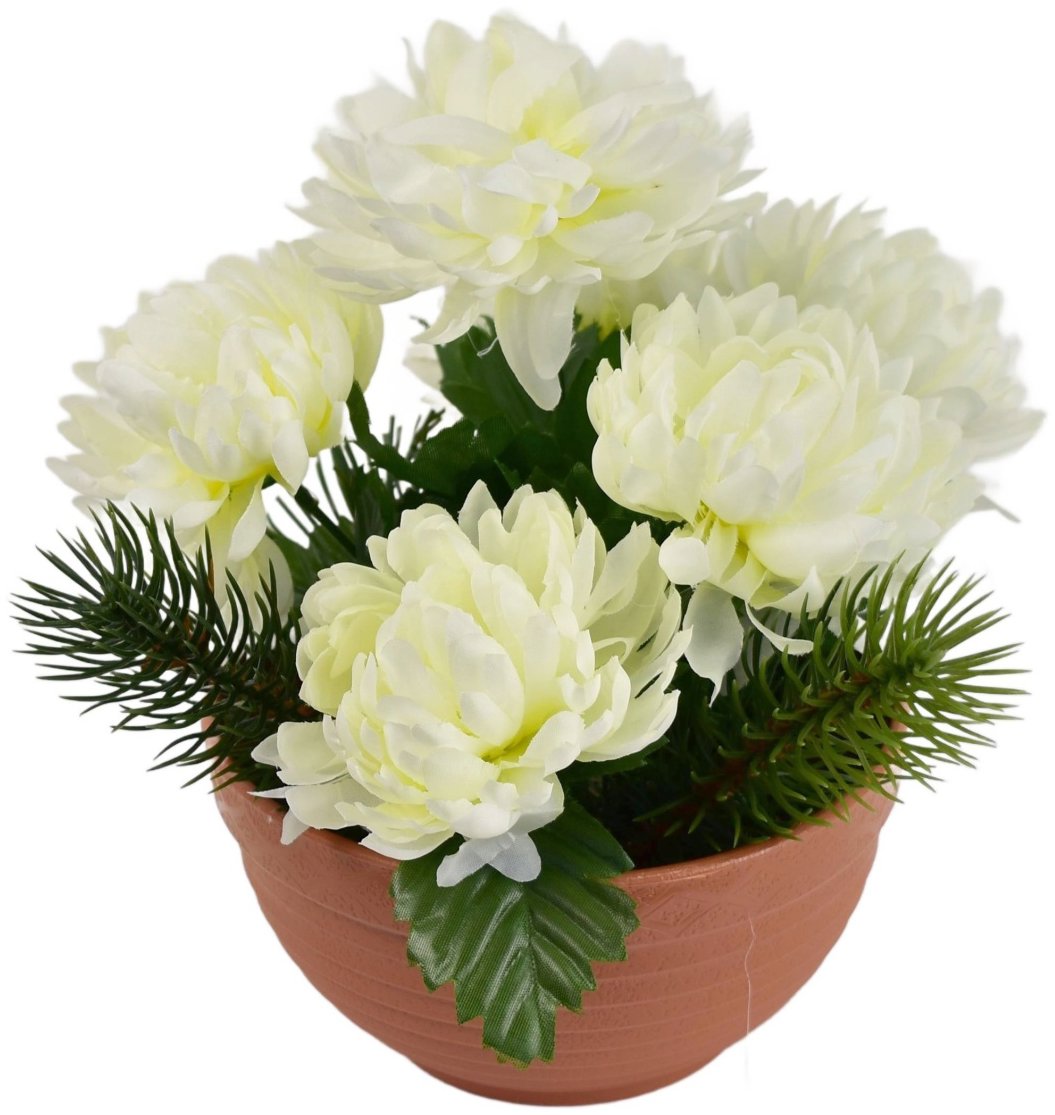 Dekorácia – jesenná miska s krémovými chryzantémami, väzba zo 6 kvetov, smútočná dekorácia, 22 × 19 cm, hmotnosť 400 g, z kvalitných materiálov plast, kov, textil a sadra, dlhá životnosť a odolnosť