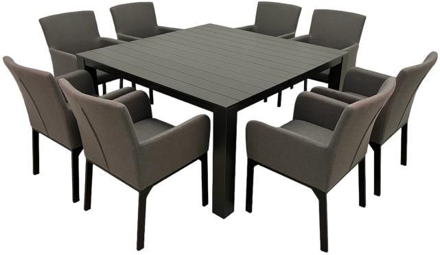Záhradný nábytok – zostava, 8 stoličiek, nosnosť 120 kg, stôl štvorec, rozmer 152 cm × 152 cm × 75 cm, materiál dosky stola hliník, materiál sedadla/opierky chrbta lavice umelý ratan Luxusná záhradná súprava DOPPLER PRATO TOMBOLO 8+1 predstavuje elegantné a vysoko odolné vonkajšie posedenie, ktoré splní očakávania aj tých najnáročnejších používateľov. Zostava obsahuje osem vystlan