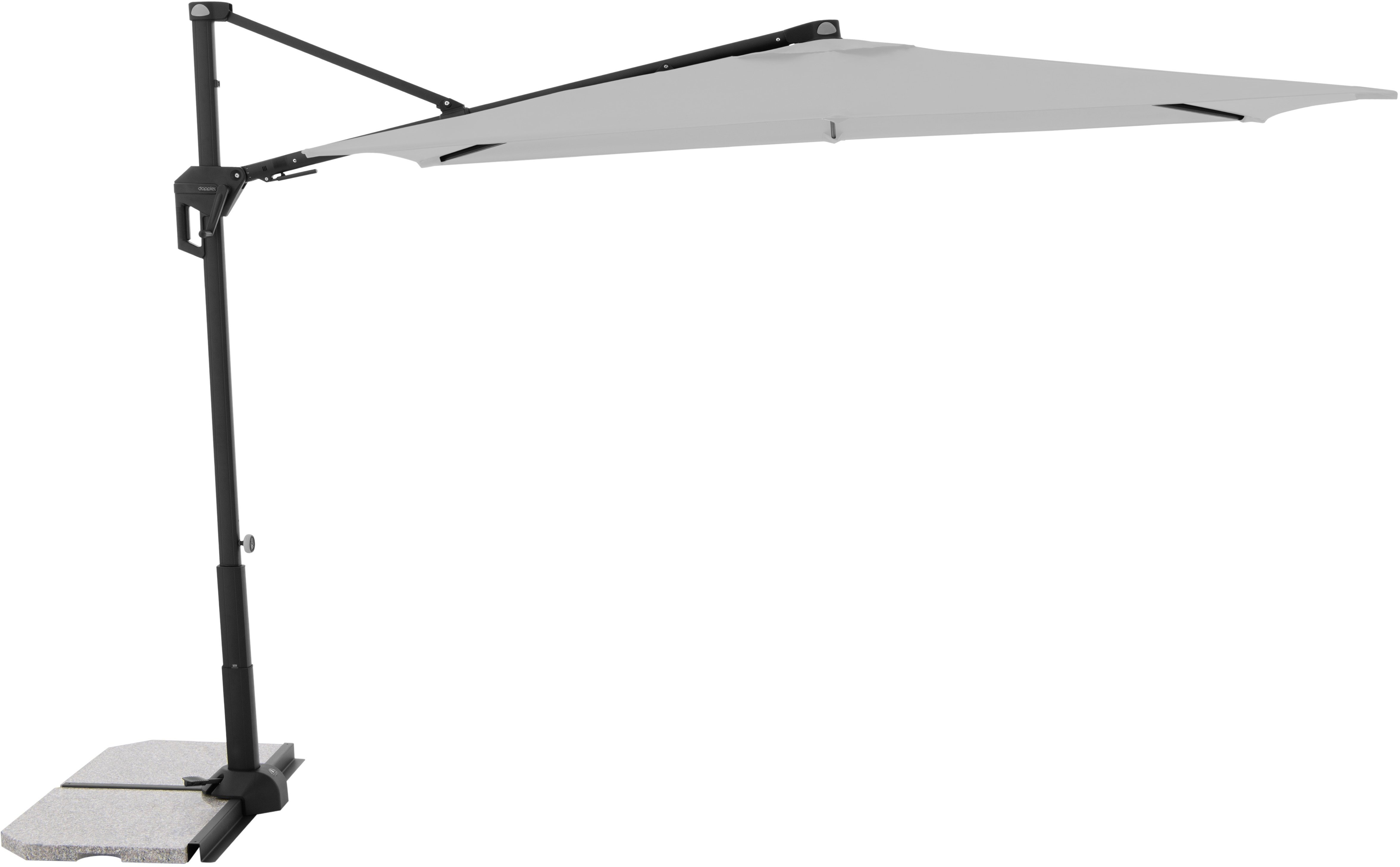 Slnečník – obdĺžnikový tvar, rozmery 2,35 × 1,35 m (V׊), ukotvenie na základňu, naklápací, roztvorenie pomocou kľučky, čierna kovová konštrukcia a sivá polyesterová plachta, hmotnosť 30 kg Slnečník v obdĺžnikovom vyhotovení DOPPLER sa umiestňuje do stabilnej základne, ktorá slúži ako opora aj pri silnejšom vetre. Jeho konštrukcia z kovu je pevná a garantuje dlhú životnosť aj pri častom
