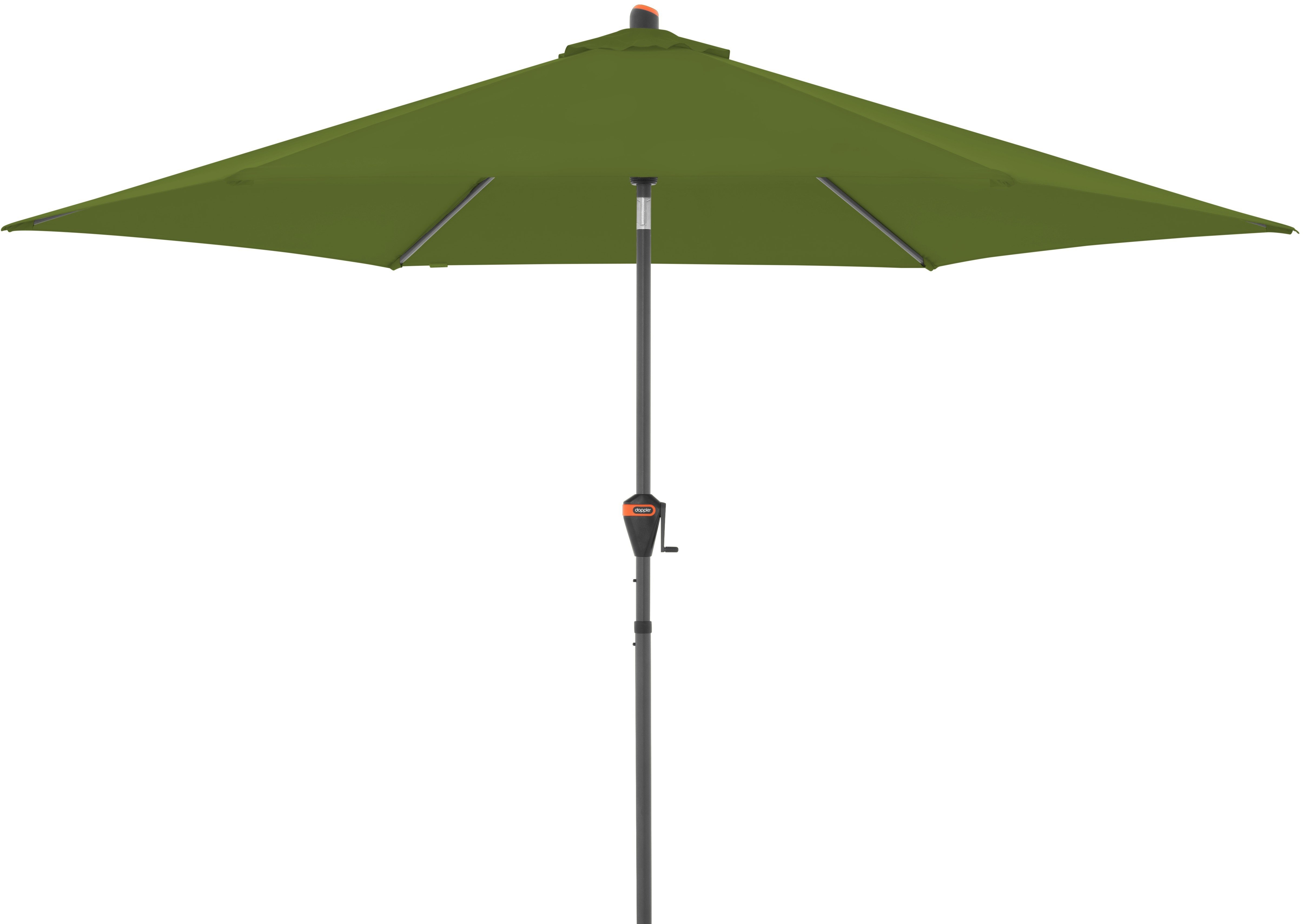 Slnečník – kruhový tvar, priemer 3,05 m, výška 2,57 m, ukotvenie na základňu, prenosný, naklápací, roztvorenie pomocou kľučky, čierna kovová konštrukcia zelená plachta Okrúhly slnečník DOPPLER sa umiestňuje do stabilnej základne, ktorá slúži ako opora aj pri silnejšom vetre. Jeho pevná kovová konštrukcia zaisťuje spoľahlivosť aj pri intenzívnom používaní. Roztvárani