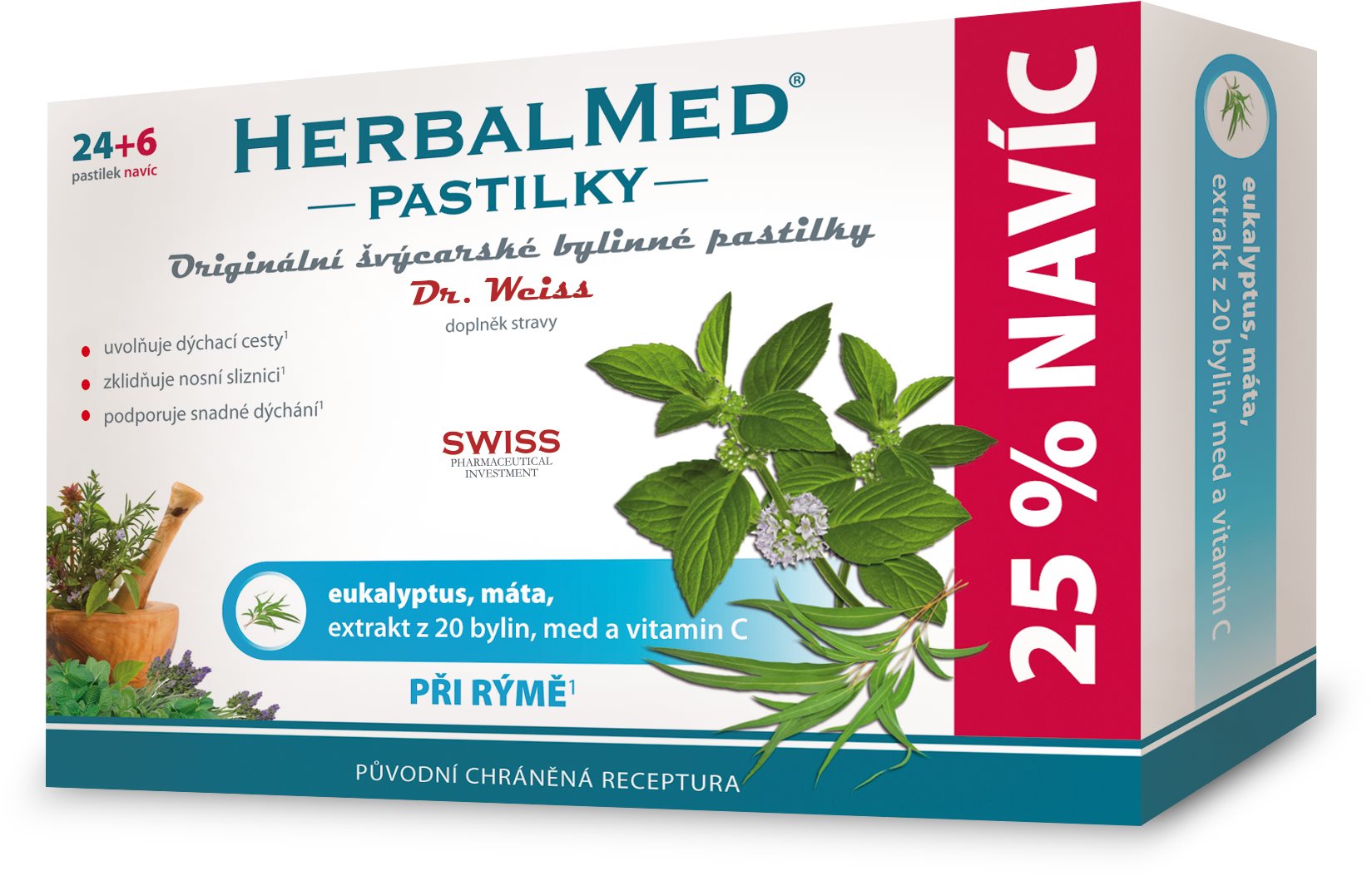 Bylinné pastilky – kombinácia eukalyptového oleja (15 mg), mentolu (15 mg), extraktu z 20 bylín (68,2 mg) a vitamínu C (26 mg), obsahuje med a napríklad sladké drievko, skorocel, černicu, mätu piepornú, harmanček a fenikel, bez umelých farbív, arómy, sladidiel a chemických konzervačných látok, 24 + 6 pastiliek Dr. Weiss HerbalMed Eukalyptus + mäta + vitamín C24 + 6 pastiliekPastilky pri nádche a upchatom noseHERBALMED® pastilky Dr. Weiss sa vyrábajú podľa pôvodnej receptúry vo Švajčiarsku. Účinnosť a jedine