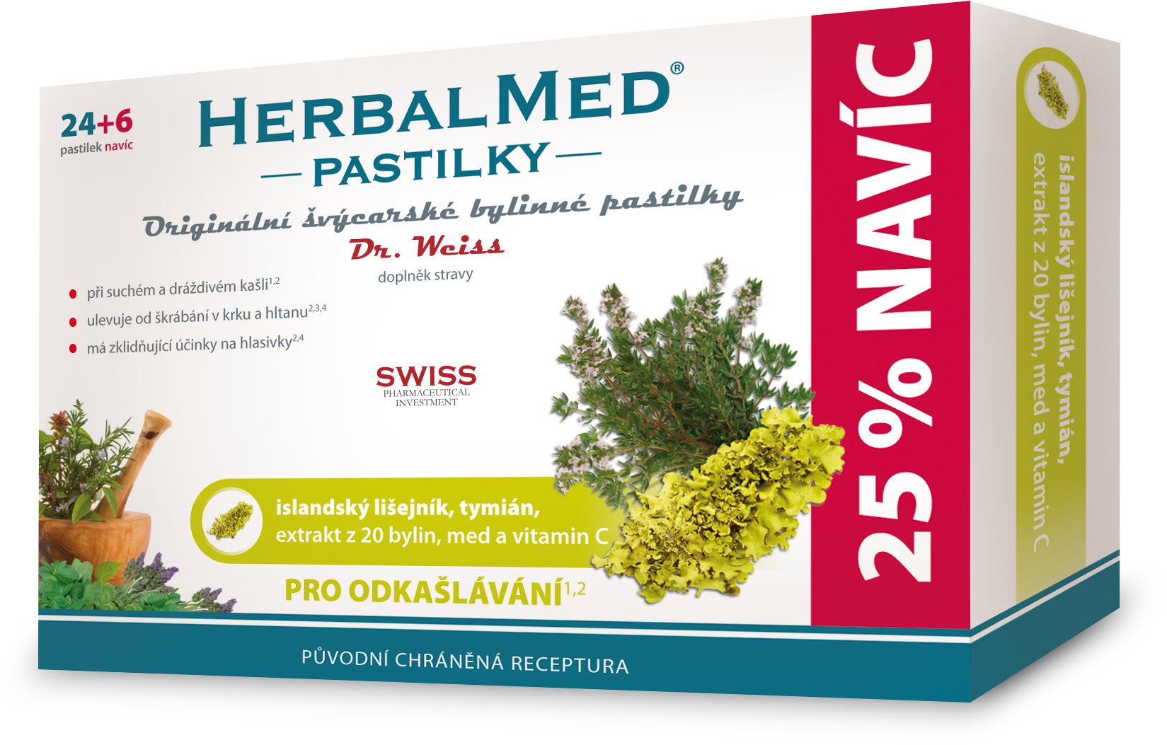 Bylinné pastilky – kombinácia extraktu pľuzgierky islandskej (20 mg), tymianového oleja (0,5 mg), mätového oleja (5 mg) a vitamínu C (40 mg), obsahuje med a ďalšie bylinné extrakty, bez umelých farbív, arómy, sladidiel a chemických konzervantov, 24 + 6 pastiliek Dr. Weiss HerbalMed Islandský lišajník + tymián + med + vitamín C24 + 6 pastiliekPastilky pri suchom kašli a škrabaní v krkuHERBALMED® pastilky Dr. Weiss sa vyrábajú podľa pôvodnej receptúry vo Švajči