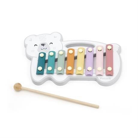 Hudobná hračka – vhodné od 1,5 roka Drevený xylofón v tvare polárneho medveďa obsahuje osem farebných kovových klávesov a dve drevené paličky. Deti si pri hre precvičujú jemnú motoriku, koordináciu pohybu a vnímanie zvukov. Telo xylofón