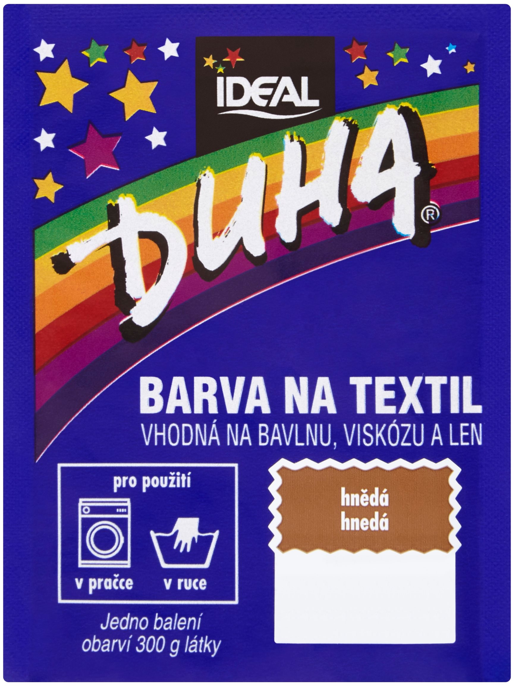 Farba na textil – vhodná na bavlnu, viskózu a ľan Hnedá farba na textil DUHA je v praktickom balení s hmotnosťou 15 g, ktoré vystačí na zafarbenie 300 g látky. Môže sa použiť nielen na bavlnu, ale tiež napríklad na ľan či viskózu. Veľmi jedno