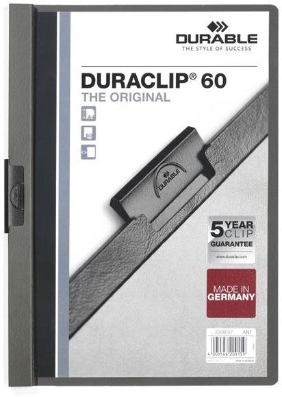Dosky na dokumenty A4 – zatváranie na klipsu, plastové, spisové, na 60 listov, sivá farba, rozmery 31 × 21,9 cm (V׊), šírka chrbta 0,8 cm Kľúčové vlastnosti dosiek na dokumenty DURABLE Duraclip A4, 60 listov, antracitové Spisové dosky Durable pomáhajú udržať dokumenty prehľadne usporiadané Uzavieranie rieši klipsa Ponúkajú dostatočný pr