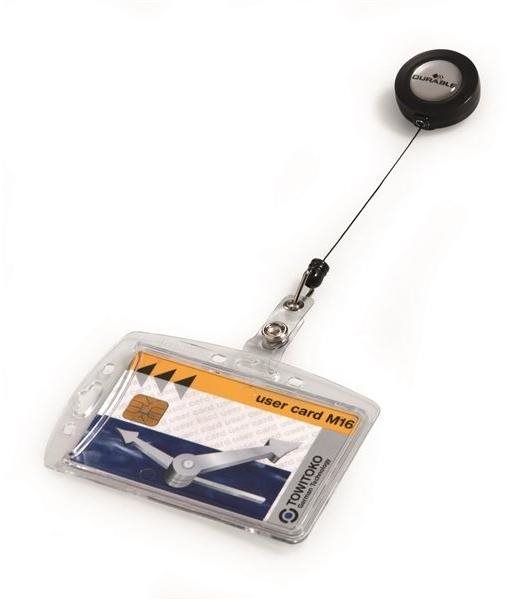 Visačka s rolosystémom, kovový klip, rozmery 10,3 × 30 cm (D׊), materiálom je akryl, transparentná a čierna farba, 10 ks v balení Menovka DURABLE Hardbox je určená na bezpečnostné, prístupové aj ID karty a menovky. Umožní ich rýchle a jednoduché použitie. Vyrobená je z akrylu a doplnená o rolo systém s navíjaním do dĺžky 80 cm,