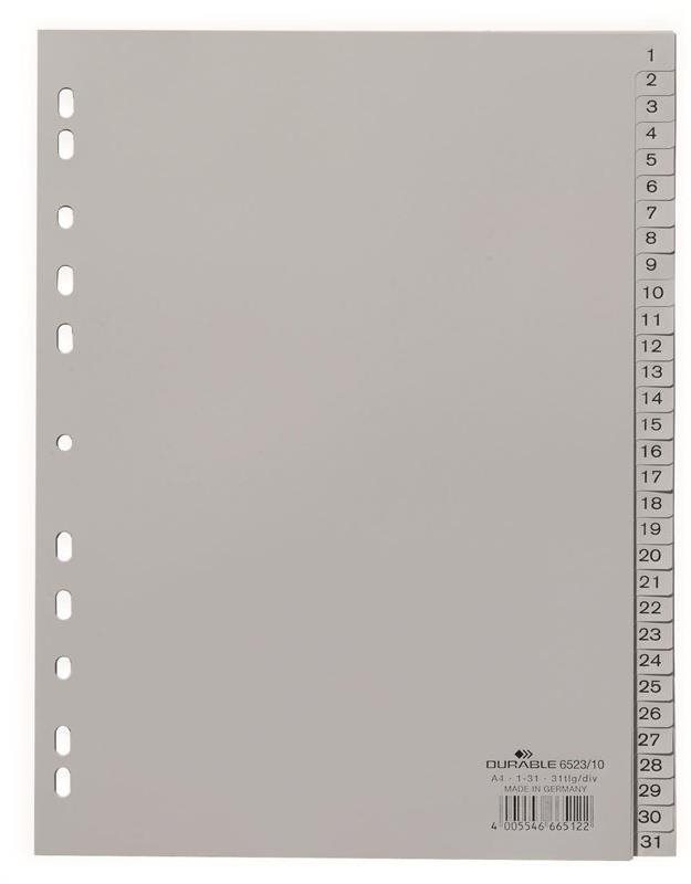 Roztrieďovač číselné roztrieďovanie, počet listov 31, materiál polypropylén, farba sivá, šírka 215 mm, výška 197 mm Roztrieďovač Durable umožní prehľadnú organizáciu dokumentov. Disponuje eurodierovaním, ktoré umožní jeho založenie do šanónu, a vyrobený je z veľmi kvalitného polypropylénu. Ponúka 31 listov, ktoré s