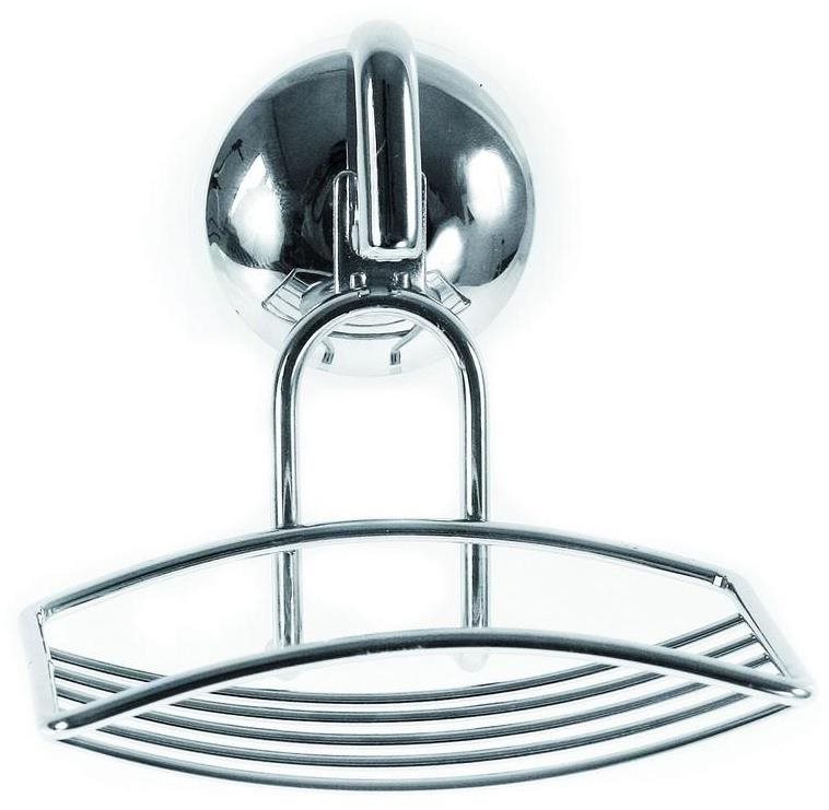 Mydelnička – na stenu, prichytenie pomocou prísaviek, atypický tvar, materiál kov, strieborná farba, rozmery 12 × 8 × 10 cm (V×H×D)
