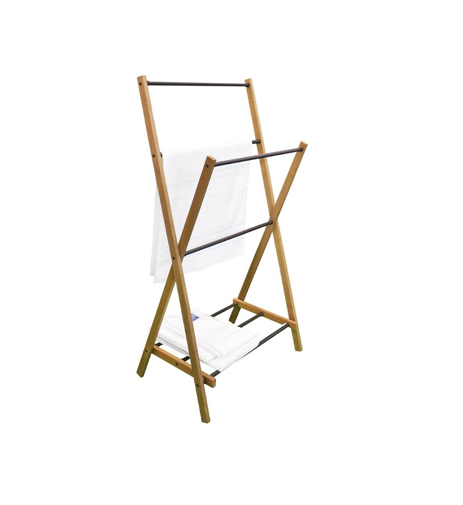Držiak na uteráky – voľne stojací, skladací, 7 háčikov/ramien, materiál kov a drevo, matný povrch, hnedá farba, rozmery 103 × 57,5 × 35 cm (V׊×H)